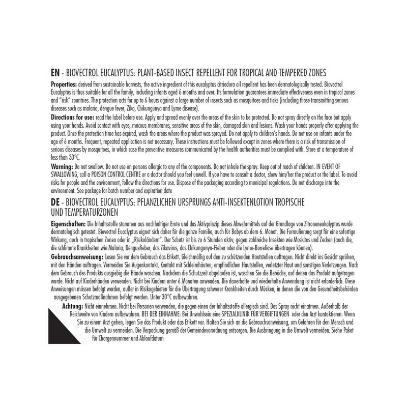 Cette lotion contient de l’essence d’eucalyptus citriodora, efficace en zones tropicales ou à risque (paludisme, dengue, chikungunya).